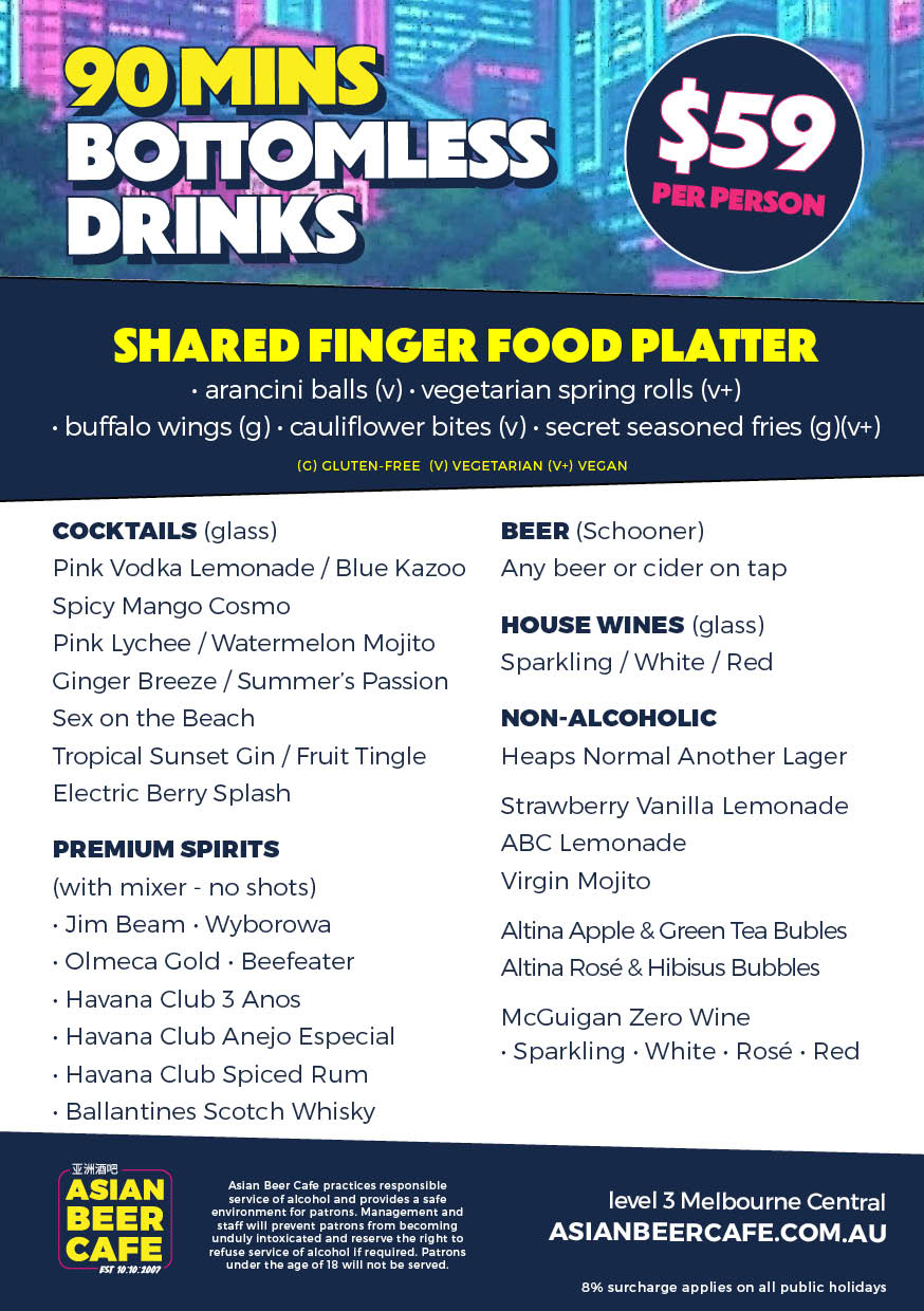 Wanna level up your chill sesh? At Asian Beer Café, you and the crew can smash 90 minutes of unlimited drinks – we’re talking cocktails on tap, a cheeky glass of wine, or a schooner of whatever beer’s flowing. Plus, you’ll get a shared platter of our fave munchies to vibe with.